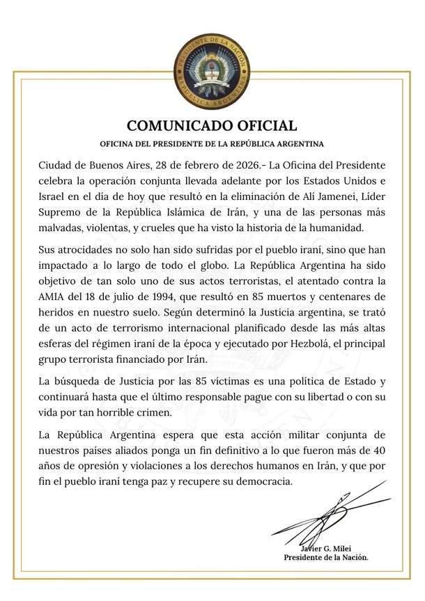 Finalmente, el primer mandatario expresó: "La República Argentina espera que esta acción militar conjunta de nuestros países aliados ponga un fin definitivo a lo que fueron más de 40 años de opresión y violaciones a los derechos humanos en Irán, y que por fin el pueblo iraní tenga paz y recupere su democracia".