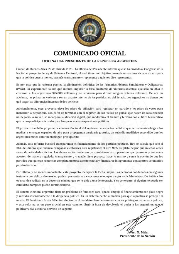 En la tarde de este miércoles 22 de abril, Javier Milei confirmó el envío del proyecto de Reforma Electoral al Congreso, a través de la cuenta de X de la Oficina del Presidente, asegurando que el mismo "tiene por objetivo corregir un sistema viciado de raíz para que la política cueste menos, sea más transparente y represente a quienes dice representar".