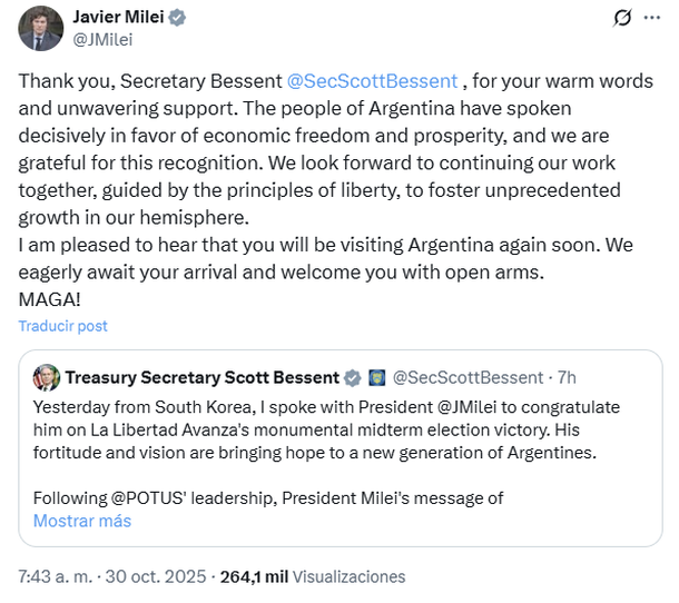 El presidente Javier Milei agradeció este jueves el llamado del secretario de Tesoro de Estados Unidos, Scott Bessent, tras el contundente triunfo de La Libertad Avanza en las elecciones legislativas y aseguró que el funcionario estadounidense vendrá “pronto” al país.