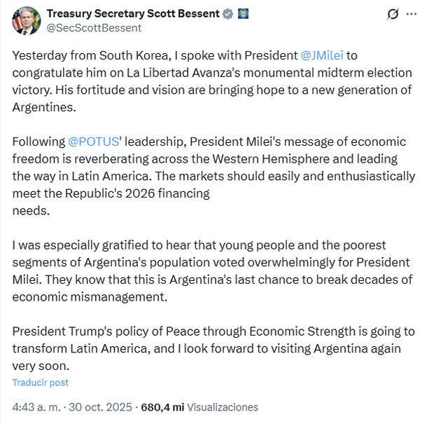 Bessent, quien se encuentra en Corea del Sur para cerrar un acuerdo comercial, consideró que, siguiendo el liderazgo de Donald Trump, “el mensaje de libertad económica del presidente Milei resuena en todo el hemisferio occidental y marca la pauta en América Latina”. Para el secretario del Tesoro de Estados Unidos, “los mercados deberían acoger con facilidad y entusiasmo la financiación de la República para 2026”.
