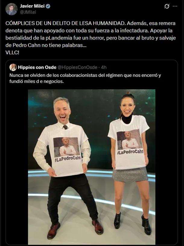 A través de la red social X, lanzó una feroz embestida contra periodistas de la señal C5N que vestían remeras con el rostro del infectólogo Pedro Cahn, acusándolos de ser "cómplices de un delito de lesa humanidad" y de apoyar una "infectadura".
