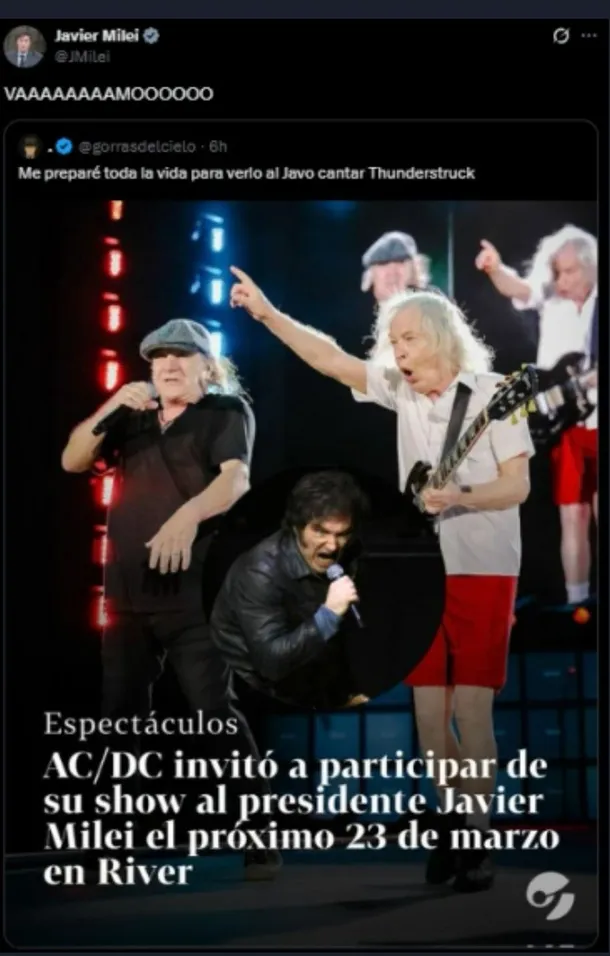 "VAAAAAAAAMOOOOOO" (sic), escribió Milei en su cuenta personal de la red social X, citando la publicación del usuario @gorrasdelcielo, que había compartido la captura falsa y expresaba "Me preparé toda la vida para verlo al Javo cantar Thunderstruck", una de las canciones de AC/DC.
