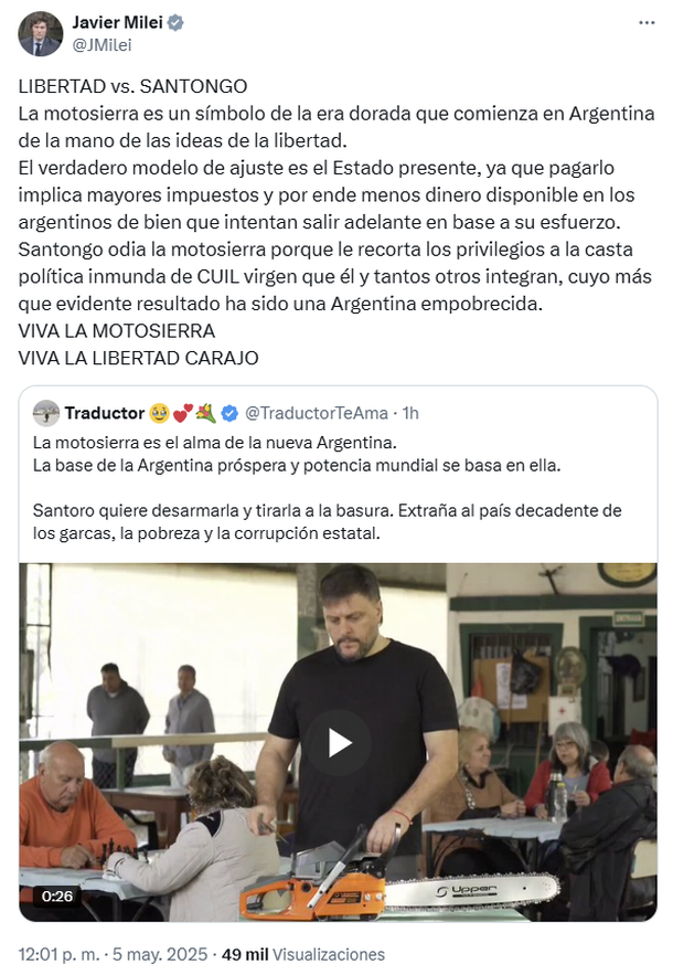 Acto seguido, el Presidente aprovechó para criticar el spot del candidato porteño al sostener que “Santongo odia la motosierra porque le recorta los privilegios a la casta política inmunda de CUIL virgen que él y tantos otros integran, cuyo más que evidente resultado ha sido una Argentina empobrecida”.