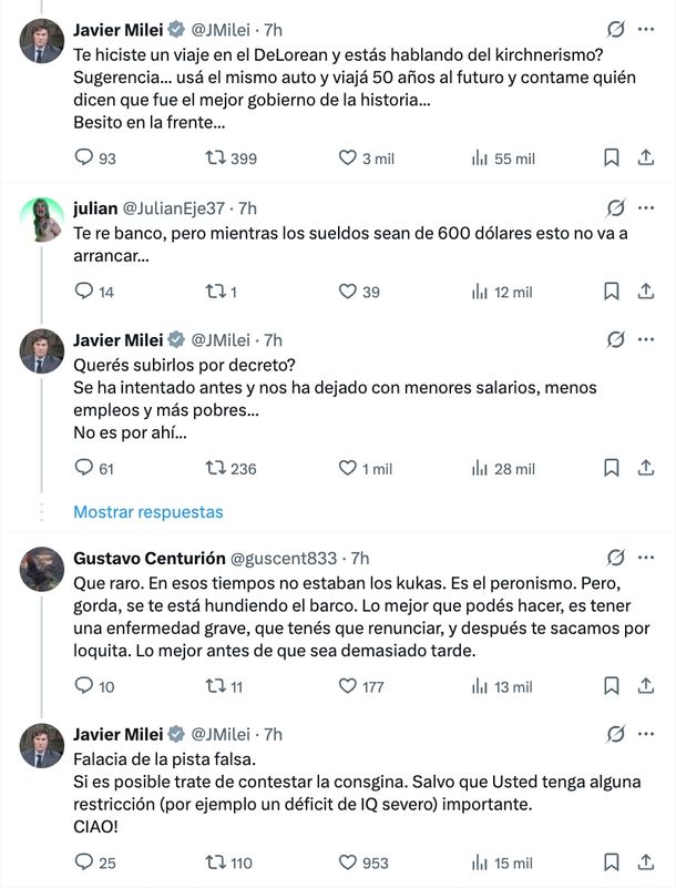 - Ironías sobre el futuro: A un usuario que lo comparó con gestiones anteriores, le sugirió usar un "DeLorean" para viajar 50 años al futuro: "Contame quién dicen que fue el mejor gobierno de la historia... Besito en la frente".