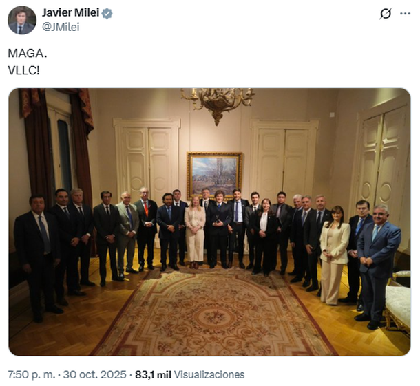 Posterior al encuentro en Casa Rosada, que también contó con todo el gabinete libertario, el primer mandatario lanzó un posteo en redes sociales que incluía una foto con los líderes provinciales y una sigla que muchos aún no conocen: "MAGA", escribió en X, tras lo cual lanzó también su ya conocido "VLLC" (Viva la libertad, carajo).