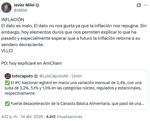 Tras lo informado por la entidad, Javier Milei no dudó en referirse al IPC: "El dato es malo. El dato no nos gusta ya que la inflación nos repugna. Sin embargo, hoy elementos duros que nos permiten explicar lo que ha pasado y especialmente esperar que a futuro la inflación retorne a su sendero decreciente. VLLC! PD: hoy explicaré en AmCham".