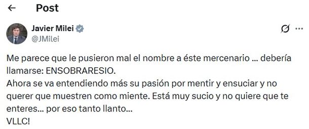 Además de republicar el video, Milei escribió: "Me parece que le pusieron mal el nombre a este mercenario... debería llamarse: ENSOBRARESIO. Ahora se va entendiendo más su pasión por mentir y ensuciar y no querer que muestren como miente. Está muy sucio y no quiere que te enteres... por eso tanto llanto... VLLC!". El posteo se inscribe en una serie de mensajes en los que el Presidente no solo cuestiona el trabajo de comunicadores, sino que directamente los acusa de operar con intereses económicos o políticos, en un tono cada vez más confrontativo desde el inicio de su gestión.