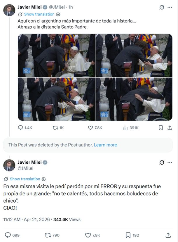 Antes de ser Presidente, Milei había dicho que Francisco era “un sorete mal cagado”, un “imbécil“, ”un impresentable” y “el representante del maligno en la Tierra ocupando el trono de la casa de Dios”, entre otra serie de insultos. Ahora, a un año de la muerte del Papa, lo recordó en X como “el argentino más importante de la historia”.