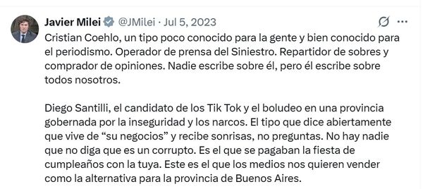 En julio de 2023 escribió: "Diego Santilli, el candidato de los Tik Tok y el boludeo en una provincia gobernada por la inseguridad y los narcos".