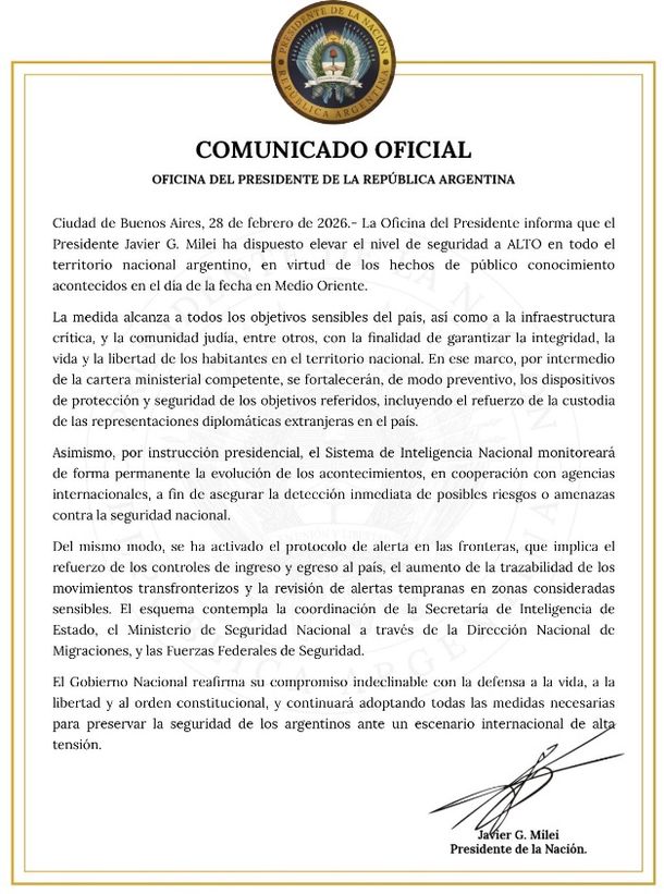 “El Gobierno reafirma su compromiso indeclinable con la defensa a la vida, a la libertad y al orden constitucional, y continuará adoptando todas las medidas necesarias para preservar la seguridad de los argentinos ante un escenario internacional de alta tensión”, concluyó el comunicado presidencial.