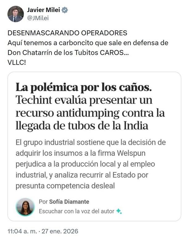 “La nueva Argentina. Si ves ‘periodistas’, ‘economistas’ y políticos hablándote de la industria del acero y los prejuicios que causa la apertura, ya sabés quién les llena el sobre”, escribió Milei en su cuenta de X. Minutos más tarde, agregó: “Desenmascarando operadores. Aquí tenemos a carboncito que sale en defensa de Don Chatarrín de los tubitos caros...”, en clara referencia a Paolo Rocca.