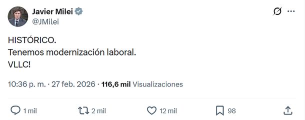 De hecho, el Presidente celebró la votación mediante las redes sociales, calificando la sanción como un hecho “histórico. Tenemos modernización laboral. VLLC!”, publicó, para luego dar sus “felicitaciones a LLA y aliados”.