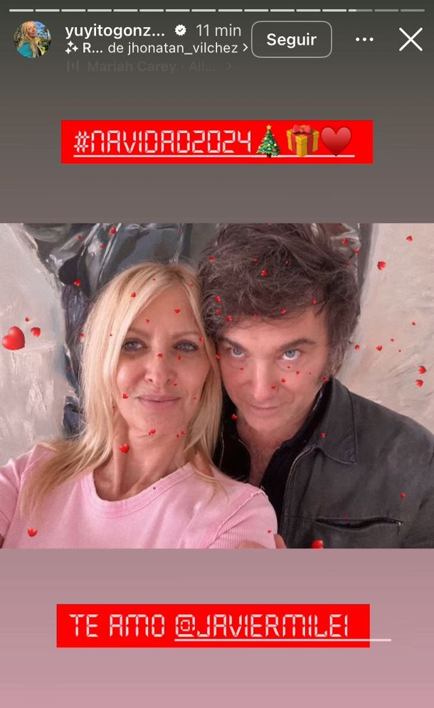 La prueba de que Milei y Yuyito han compartido un almuerzo pre-navideño juntos fue la publicación que realizó la exvedette en su Instagram, donde se los puede ver muy pegados uno al otro, mientras suena "All I want for Christmas is you" de Mariah Carey.