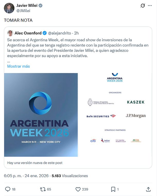Además, “a lo largo de la semana intervendrán el Canciller Pablo Quirno, el Ministro de Economía, Luis Caputo, el Jefe de Gabinete Manuel Adorni y el Ministro de Desregulación y Transformación del Estado, Federico Sturzenegger, quienes expondrán los lineamientos centrales de la estrategia política, económica y regulatoria del gobierno argentino”, amplió el embajador en redes sociales.