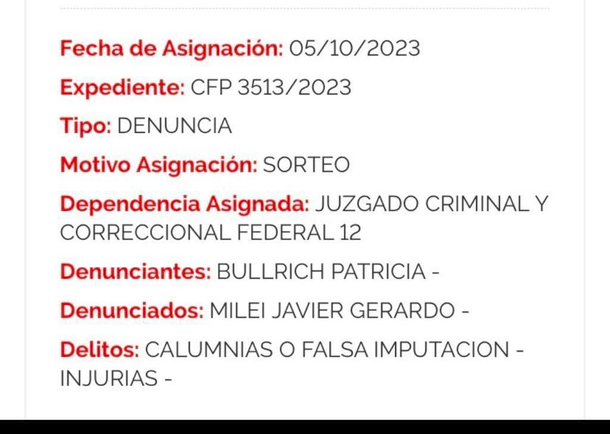 El 5 de octubre de 2023 la ex candidata a Presidenta de la Nación Patricia Bullrich denunció por "calumnias o falsa imputación - injurias" a Javier Gerardo Milei.