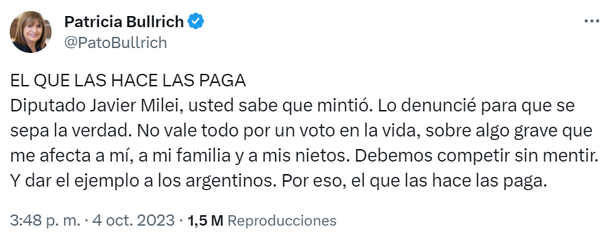 "EL QUE LAS HACE LAS PAGA Diputado Javier Milei, usted sabe que mintió. Lo denuncié para que se sepa la verdad. No vale todo por un voto en la vida, sobre algo grave que me afecta a mí, a mi familia y a mis nietos. Debemos competir sin mentir. Y dar el ejemplo a los argentinos. Por eso, el que las hace las paga", escribió Bullrich en sus redes sociales.