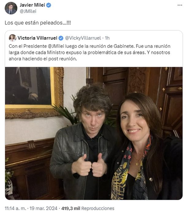 Este martes por la mañana, Villarruel publicó una foto en las redes sociales junto a Milei al finalizar la reunión con ministros en la Casa Rosada y escribió: “Con el Presidente @JMilei luego de la reunión de Gabinete. Fue una reunión larga donde cada Ministro expuso la problemática de sus áreas. Y nosotros ahora haciendo el post reunión”.