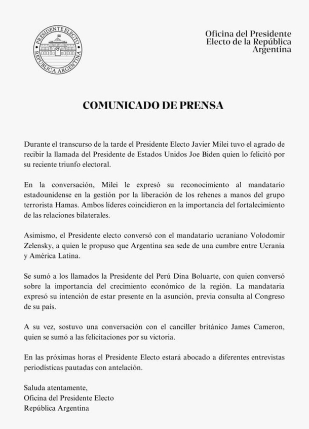 Desde la victoria en el balotaje, todos los días a las 18 horas, la nueva oficina de prensa emite un comunicado para contar las novedades sobre las actividades del libertario.