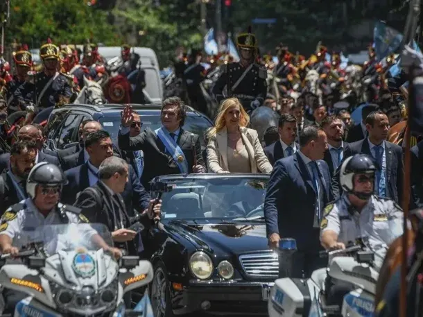 Sonriente, con la banda presidencial sobre el torso y el bastón de mando en la mano, Milei realizó la mayoría del trayecto entre la Plaza Congreso y la Plaza de Mayo en un automóvil descapotable, saludando a miles de ciudadanos, escoltado por los Granaderos a Caballo y en algunos tramos se bajó para saludar a los simpatizantes que se congregaron a lo largo de la avenida de Mayo, portando banderas argentinas.