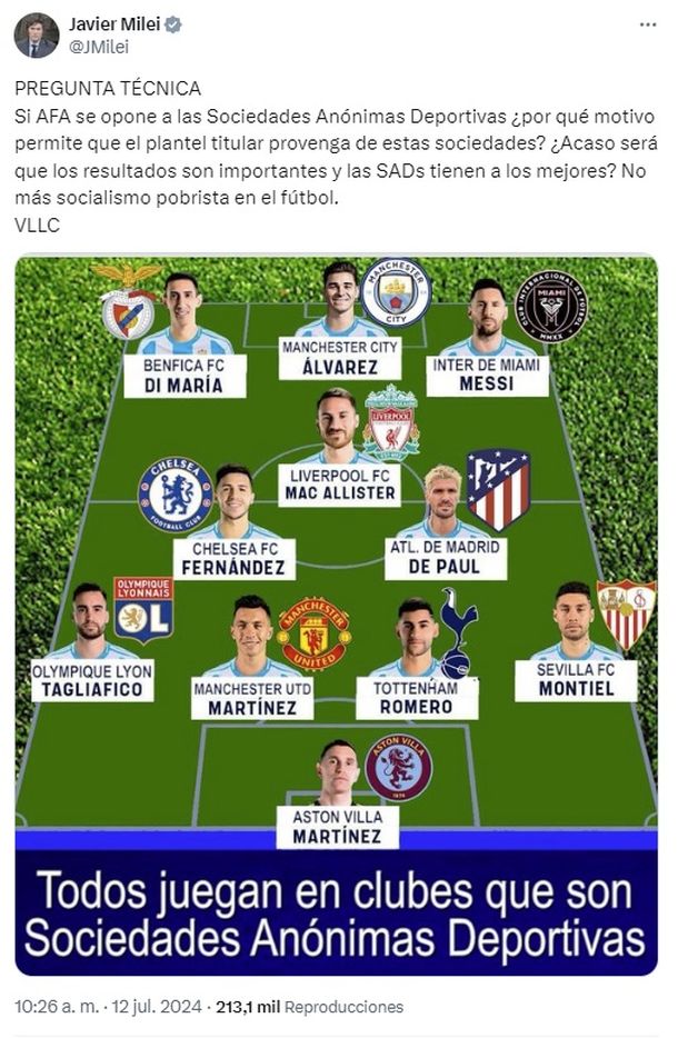“Pregunta técnica”, comenzó Milei casi con tono irónico en una publicación en su cuenta personal de X (antes Twitter), donde compartió una foto de la Selección argentina indicando el equipo del cual proviene cada jugador y una aclaración: todos juegan en clubes que son Sociedades Anónimas Deportivas.