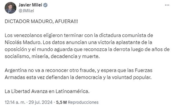 “Los datos anuncian una victoria aplastante de la oposición y el mundo aguarda que reconozca la derrota luego de años de socialismo, miseria, decadencia y muerte. Argentina no va a reconocer otro fraude, y espera que las Fuerzas Armadas esta vez defiendan la democracia y la voluntad popular. La Libertad Avanza en Latinoamérica”, expresó en su cuenta de X.