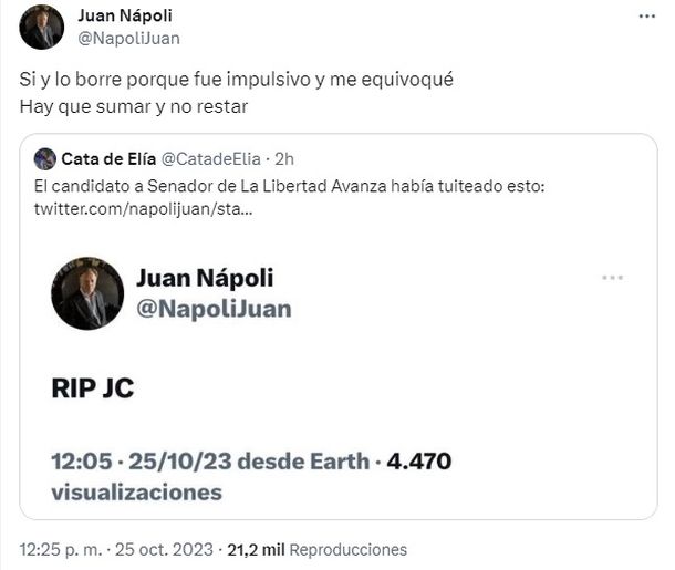 Juan Nápoli, postulante a senador por La Libertad Avanza, había publicado "RIP JXC" en medio de las negociaciones entre los dos espacios de cara al balotaje.
