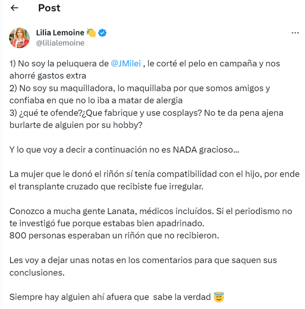 La interna menos pensada explotó en las últimas horas y tiene que ver con un posteo muy fuerte de la peluquera y maquilladora de Javier Milei, Lilia Lemoine, quién también es candidata a diputada nacional por La Libertad Avanza por la provincia de Buenos Aires, contra el referente macrista Jorge Lanata.