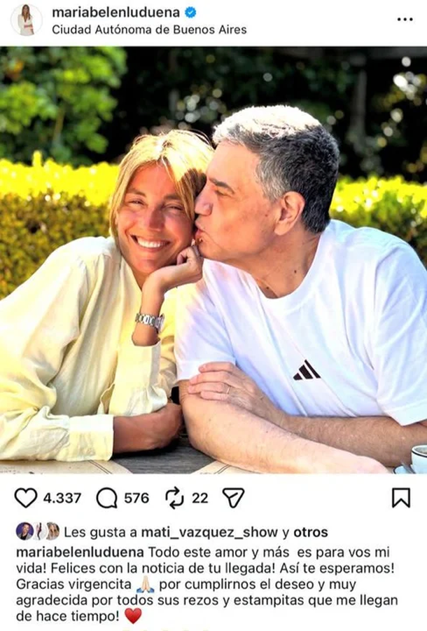 En la foto, ambos aparecen abrazados y sonrientes, transmitiendo la felicidad que atraviesan con la llegada del bebé. “Todo este amor y más es para vos, mi vida. Felices con la noticia de tu llegada. ¡Así te esperamos! Gracias virgencita por cumplirnos el deseo y muy agradecida por todos sus rezos y estampitas que me llegan desde hace tiempo”, escribió la conductora, acompañando el mensaje con un corazón rojo.