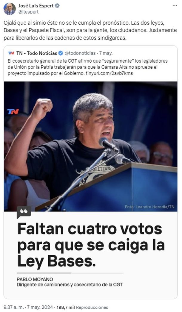 En los últimos días Espert fue noticia por sus reacciones en las redes sociales. Esta misma semana, el presidente de la Comisión de Presupuesto y Hacienda calificó de “simio” a Pablo Mayano, secretario general de la CGT, por oponerse al tratamiento de la Ley Bases en el Senado.