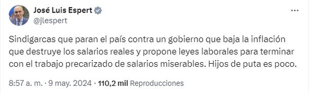 “Sindigarcas que paran el país contra un gobierno que baja la inflación que destruye los salarios reales y propone leyes laborales para terminar con el trabajo precarizado de salarios miserables”, escribió en su cuenta de X y lanzó: “Hijos de pu... es poco”.