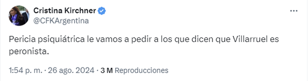 "Pericia psiquiátrica le vamos a pedir a los que dicen que Villarruel es peronista", lanzó Cristina en su cuenta de X tras el intercambio amistoso que mantuvo el jefe del bloque de senadores de Unión por la Patria con la Vicepresidente, donde intercambiaron risas y frases irónicas en el recinto.