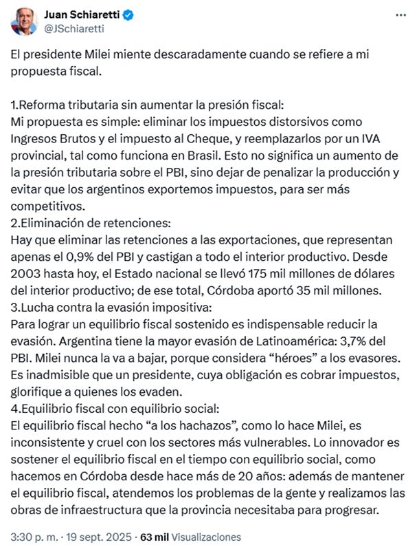 Poco después de las palabras del mandatario, Juan Schiaretti usó las redes sociales para responderle, asegurando que “el presidente Milei miente descaradamente cuando se refiere a mi propuesta fiscal".