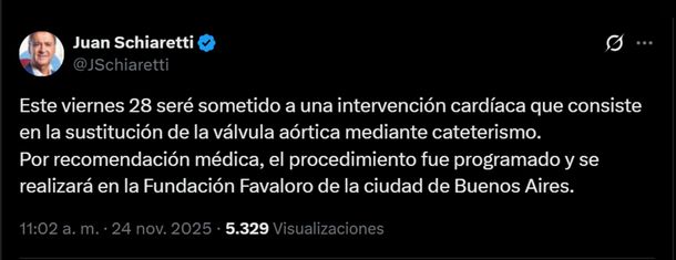 A través de un comunicado que publicó en sus redes sociales, el propio dirigente explicó los motivos de la operación y brindó detalles sobre su cuadro de salud: "Este viernes 28 seré sometido a una intervención cardíaca que consiste en la sustitución de la válvula aórtica mediante cateterismo", expresó.