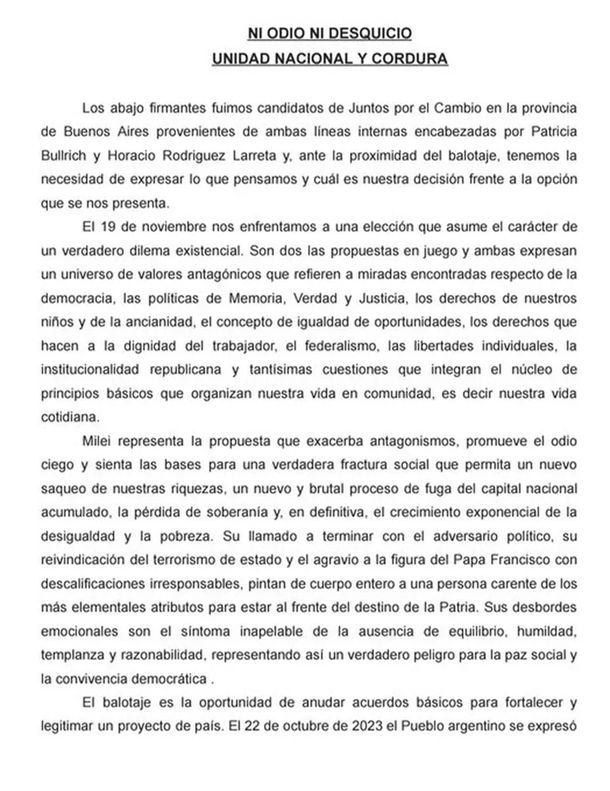 A poco más de una semana de la realización del balotaje en el que se enfrentarán los candidatos de Unión por la Patria (UxP), Sergio Massa, y de La Libertad Avanza (LLA), Javier Milei, decenas de excandidatos de Juntos por el Cambio suscribieron un documento público titulado “Ni odio ni desquicio. Unidad Nacional y Cordura”.