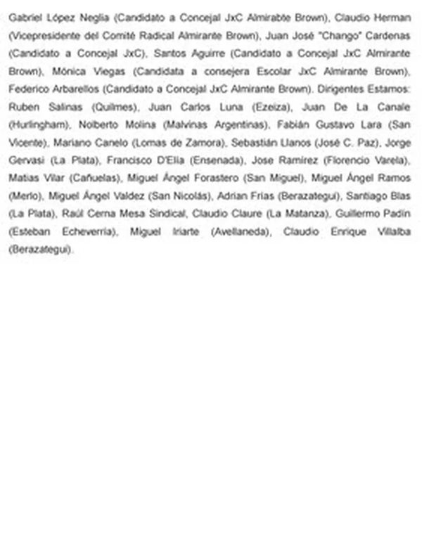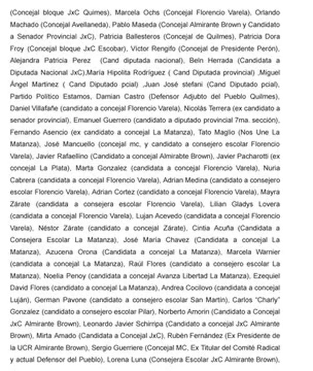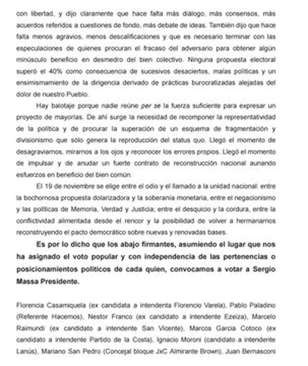 En ese marco y luego de explayarse con fuertes críticas dirigidas al candidato de LLA, “los abajo firmantes, asumiendo el lugar que nos ha asignado el voto popular y con independencia de las pertenencias o posicionamientos políticos de cada quien, convocamos a votar a Sergio Massa Presidente”.