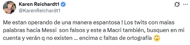 “¡Me están operando de una manera espantosa ! Los twits con malas palabras hacia Messi son falsos y este a Macri también, busquen en mi cuenta y verán q no existen… Encima con faltas de ortografía”, aseguró la ahora líder de lista de diputados bonaerenses de La Libertad Avanza.