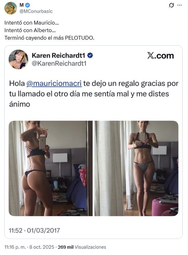“Intentó con Mauricio... Intentó con Alberto... Terminó cayendo el más PELOTUDO”, escribió el usuario en la red social X donde hizo mención a un supuesto mensaje donde se lee: “Hola @mauriciomacri te dejo un regalo gracias por tu llamado el otro día me sentía mal y me distes ánimo (sic)”. Junto al texto, dos fotos de Karen posando en ropa interior.