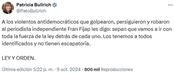 En este sentido, Patricia Bullrich se refirió a lo sucedido con una fuerte advertencia a quienes reaccionaron a la presencia provocadora del influencer de La Libertad Avanza: "A los violentos antidemocráticos que golpearon, persiguieron y robaron al periodista independiente Fran Fijap les digo: sepan que vamos a ir con toda la fuerza de la ley detrás de cada uno. Los tenemos a todos identificados y no tienen escapatoria", escribió en su cuenta de X. Luego, finalizó con la frase "ley y orden", para fijar su postura ante estos hechos.