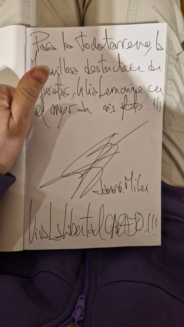 Por su parte, Milei realizó un dedicatoria personalizada para su maquilladora personal: "Para la todo terreno, la maravillosa destructora de operetas, Lilia Lemoine, con el mayor de mis afectos. ¡Viva la Libertad, carajo!", expresó.