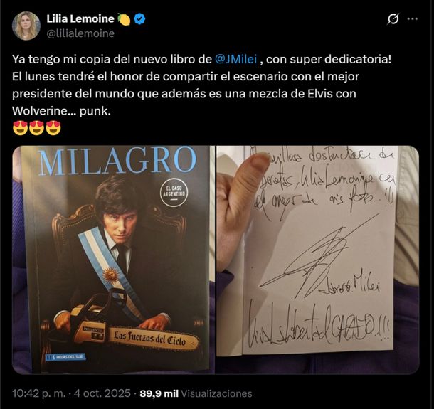 La diputada Lilia Lemoine publicó en su cuenta de X que recibió un ejemplar del nuevo libro del presidente Javier Milei, "La construcción del milagro", acompañado de una sentida dedicatoria.