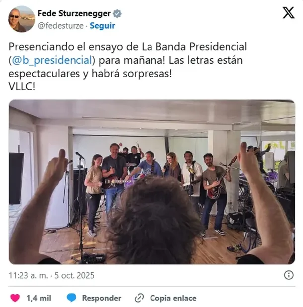 En este contexto, el ministro Federico Sturzenegger compartió en su cuenta de X una imagen del ensayo en la que se ve al presidente de espalda, con el micrófono; la diputada Lilia Lemoine, en coros; los hermanos Bertie y Joaquín Benegas Lynch, Marcelo Duclos y su pareja Ana Tamagno, el abogado Fernando Mezzina, Hernán Scarfó y Mario Suli. Esto fue replicado rápidamente replicado por Javier Milei, con la frase: "Vení, probá la banda…".