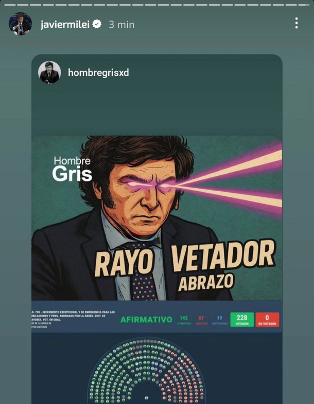 Tras lanzar un contundente mensaje en redes sociales donde anticipa su veto a "cualquier cosa que atente contra el déficit cero", el Presidente dedicó horas de la medianoche y madrugada a compartir los posteos de sus trolls. Uno de ellos llamó poderosamente la atención, dado que se trataba de una caricatura del primer mandatario con la leyenda "rayo vetador", a modo de burla.