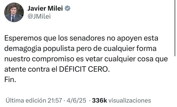 El Presidente volvió a utilizar sus redes sociales para nuevamente pronunciarse en contra de los legisladores que defendieron un proyecto a favor de los más vulnerables: "Esperemos que los senadores no apoyen esta demagogia populista pero de cualquier forma nuestro compromiso es vetar cualquier cosa que atente contra el DÉFICIT CERO".