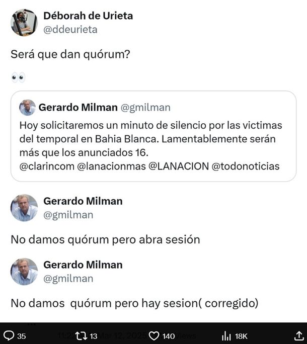 Consultado por la periodista parlamentaria Déborah de Urieta sobre al postura del macrismo a la hora de dar o no el quórum este miércoles para que se habilite la sesión especial, Milman le respondió que no lo harán pero que de todas manera "abra sesión" (sic).