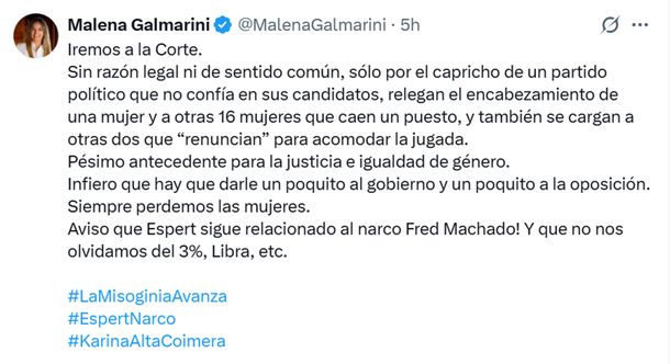 “Sin razón legal ni de sentido común, sólo por el capricho de un partido político que no confía en sus candidatos, relegan el encabezamiento de una mujer y a otras 16 mujeres que caen un puesto, y también se cargan a otras dos que ‘renuncian’ para acomodar la jugada”, indicó la dirigente peronista a través de las redes sociales.
