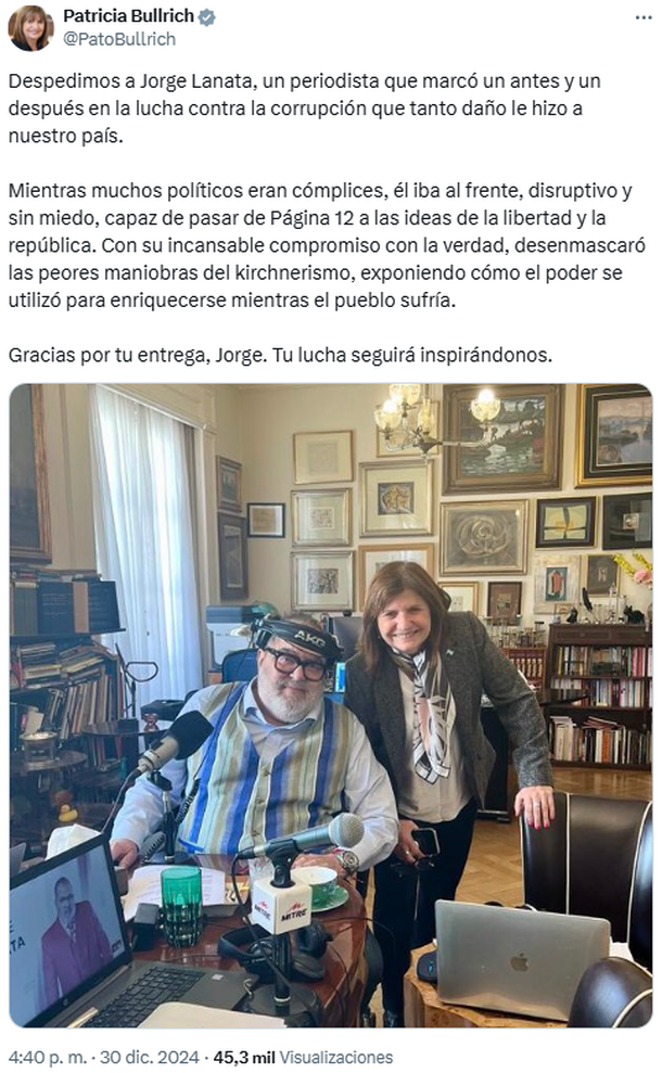 En un mensaje profundamente politizado, la libertaria señaló: "Despedimos a Jorge Lanata, un periodista que marcó un antes y un después en la lucha contra la corrupción que tanto daño le hizo a nuestro país. Mientras muchos políticos eran cómplices, él iba al frente, disruptivo y sin miedo, capaz de pasar de Página 12 a las ideas de la libertad y la república", comenzó escribiendo en su cuenta de X.