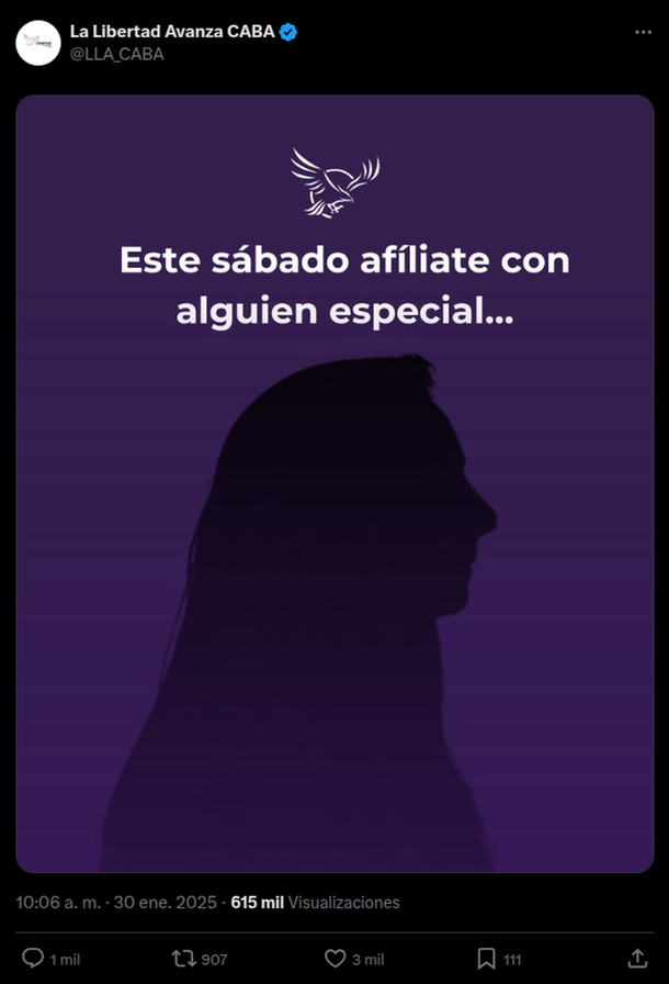 "Este sábado, afíliate con alguien especial...", publicaron este jueves desde el perfil porteño de X de La Libertad Avanza. El mensaje estaba escrito en letras blancas, con una tilde en el verbo y los puntos suspensivos, sobre un fondo violáceo con la sombra que los seguidores de la fuerza libertaria no tardaron en identificar: Karina Milei, la hermana y armadora política del Presidente.