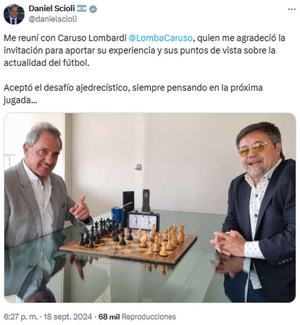 "Me reuní con Caruso Lombardi @LombaCaruso, quien me agradeció la invitación para aportar su experiencia y sus puntos de vista sobre la actualidad del fútbol. Aceptó el desafío ajedrecístico, siempre pensando en la próxima jugada...", escribió el funcionario libertario en su cuenta de X, con una foto donde se los ve a ambos sonrientes, con tablero de ajedrez de por medio.
