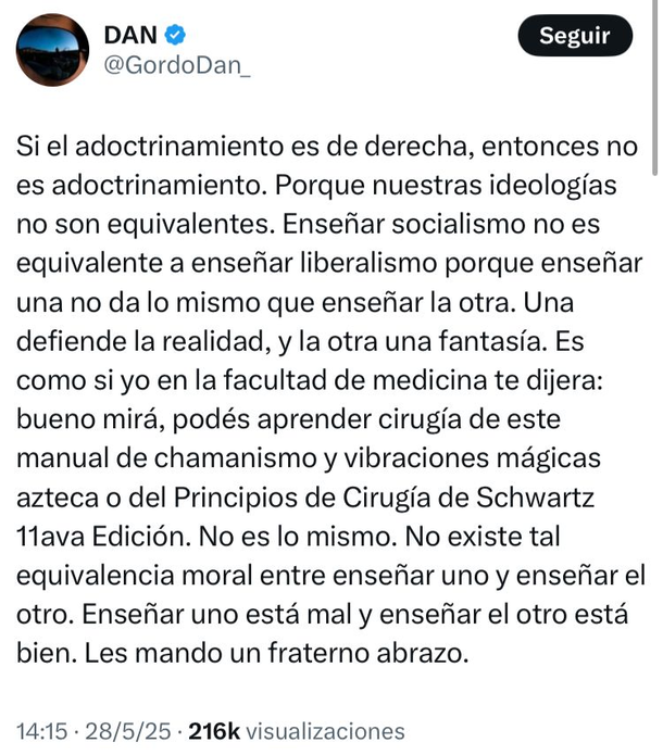 Y agregó: "Es como si yo en la facultad de medicina te dijera: bueno mirá, podés aprender cirugía de este manual de chamanismo y vibraciones mágicas azteca o del Principios de Cirugía de Schwartz 11ava Edición. No es lo mismo. No existe tal equivalencia moral entre enseñar uno y enseñar el otro. Enseñar uno está mal y enseñar el otro está bien. Les mando un fraterno abrazo".