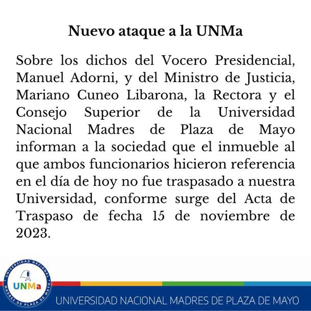 “La Rectora y el Consejo Superior de la Universidad Nacional Madres de Plaza de Mayo informan a la sociedad que el inmueble al que ambos funcionarios hicieron referencia en el día de hoy no fue traspasado a nuestra Universidad, conforme surge del Acta de Traspaso de fecha 15 de noviembre de 2023”, se afirma en dicha declaración.